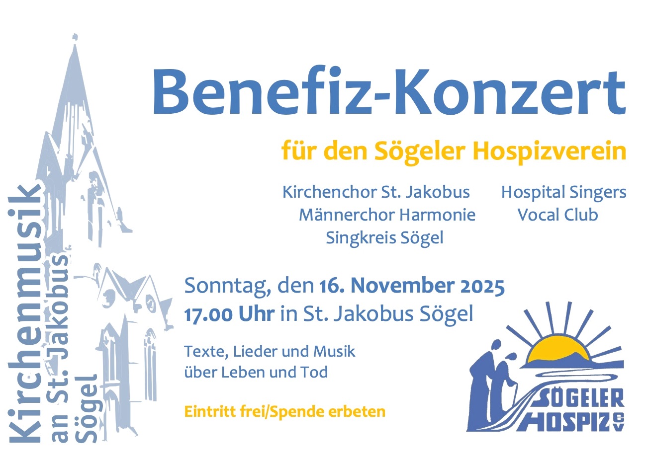 Der Sögeler Hospizverein lädt am Sonntag, den 16. November 2025 um 17 Uhr zum traditionellen Benefizkonzert ein. In diesem Jahr dürfen wir in der St. Jakobus Kirche in Sögel zu Gast sein, wo der Männerchor Harmonie unter der Leitung von Thomas Kramer, der Singkreis Sögel unter der Leitung von Theresa Mühlenberg, der Kirchenchor St. Jakobus unter der Leitung von Jörg Christian Freese, die Hospital Singers unter der Leitung von Bernd Norda und der Vocal Club unter der Leitung von Christian Velden ihr Können darbieten und mit eigens einstudierten Liedern über das Leben und den Tod die Zuhörer aufhorchen lassen werden.